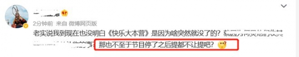 大部分网友主要是觉得有些疑惑,也有人猜测可能是《快乐大本营》改版后节目没了,所以也不太适合再提。