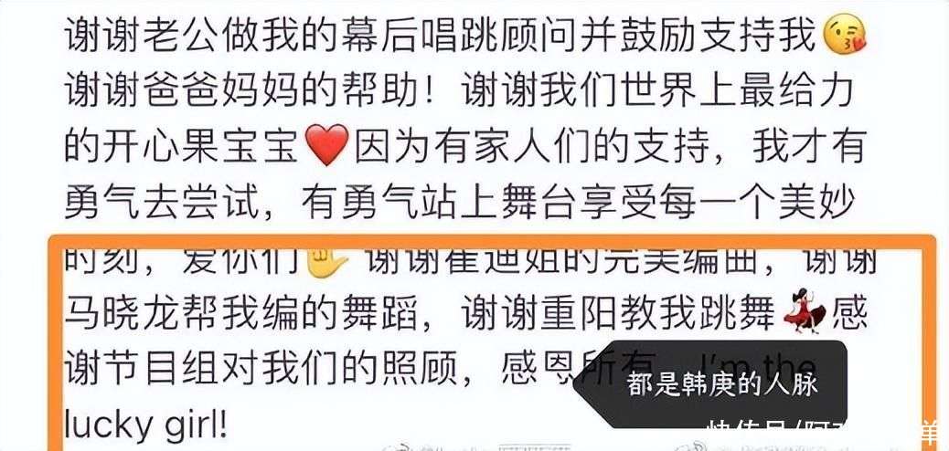 韩庚为卢靖姗加油打气时,卢靖姗发了一条微博,里面是感谢韩庚给她的帮助,比如帮她联系编曲老师,请舞蹈老师教她跳舞,这些都是韩庚请来帮助妻子的,可见他对妻子事业很支持。