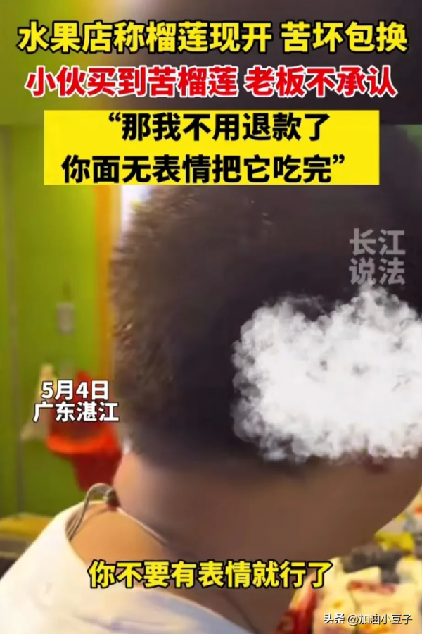 老板也不含糊,捧着榴莲就吃,只不过表情稍微有些痛苦。男子见状直接掏出手机将这一幕拍摄下来,并要求老板将榴莲全部吃下去,只要不要有表情就行了,你吃完我就不退款了。