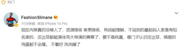很快,也有大V出面爆料庄达菲了,直言不看好,还甩出一句:"庄达菲都能演徐克大导演的黄蓉了,要不是姚晨,哪门子认识庄达菲"。