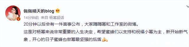 官宣前一天,杨幂父亲就发文透露好日子到来,暗示官宣离开嘉行公司。接着,杨幂大粉也称杨幂会有大喜事公布,是一个对杨幂来说非常重要的人生决定,希望粉丝们给予支持,做她最坚强的后盾。
