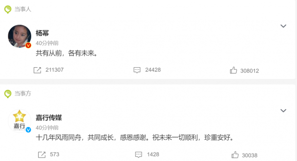 差不多同一时间,嘉行传媒也通过社交平台官宣与杨幂解约,文案为"十几年风雨同舟,共同成长,感恩感谢。祝未来一切顺利,珍重安好。"