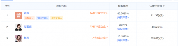 那么回到嘉行传媒成立之初,曾嘉、赵若尧和杨幂是三大股东,分别持股45.5625%、20.25%和15.1875%,当时公司总投资仅2000万,相当于八年的时间,公司市值翻了250倍!