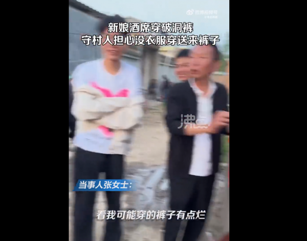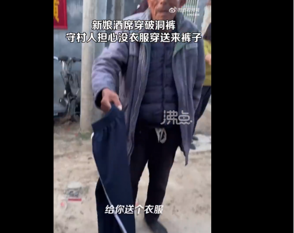 当事人张女士表示,当天参加自己的婚礼酒席,穿的是破洞裤,村里的失聪守村人看自己的裤子有点烂,以为没裤子穿,回到家找来了裤子给自己,感觉很暖。