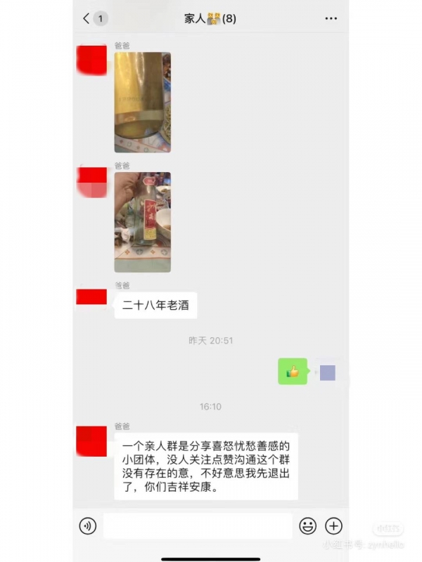 内蒙古的一位爸爸因为在群里分享生活时无人回应,决定退出家族群。离开前,他在群里留下一段话,"一个亲人群是分享喜怒忧愁善感的小团体,没人关注、点赞、沟通,这个群没有存在的意(义),不好意思我先退出了,你们吉祥安康。"
