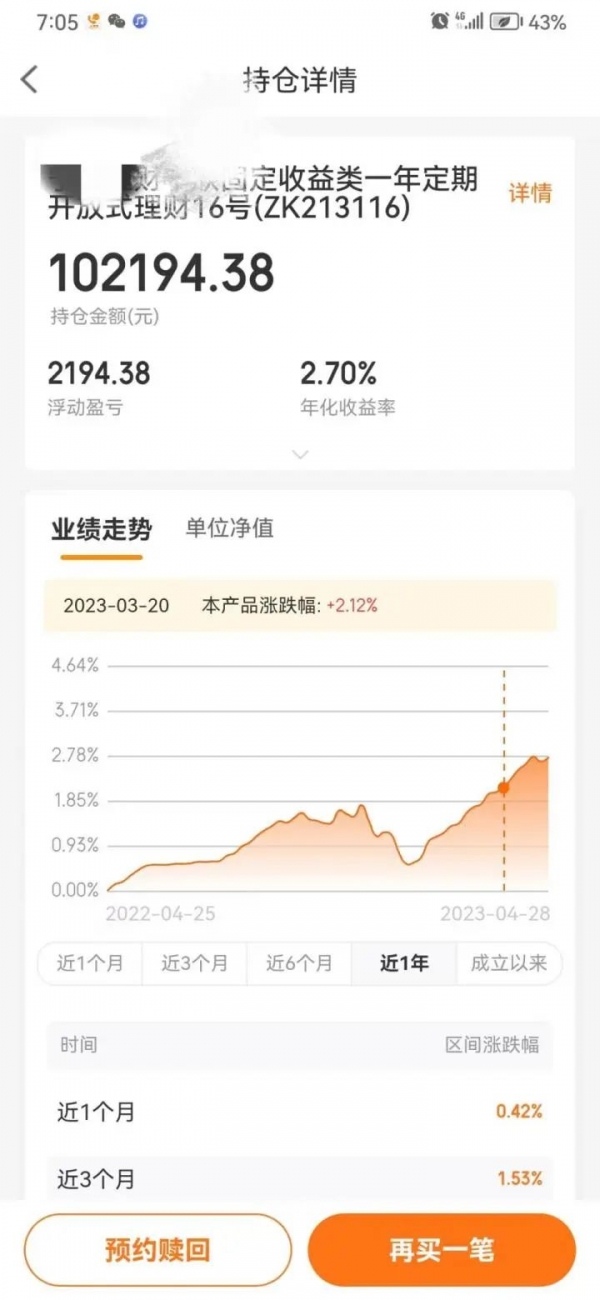 王女士告诉潮新闻记者,之前也买过股票、基金,都是亏损出局,亏了几万之后,再也不玩了,只敢配置稳健点的银行存款产品。一年前,她还买了一款银行理财产品,总计10万元,但是没想到理财产品也曾一度出现过亏损,目前已经回上来了,这个月底到期,目前来看,快一年了,收益2.7%左右,她觉得也不是很安稳,到期后也打算不做理财产品了。