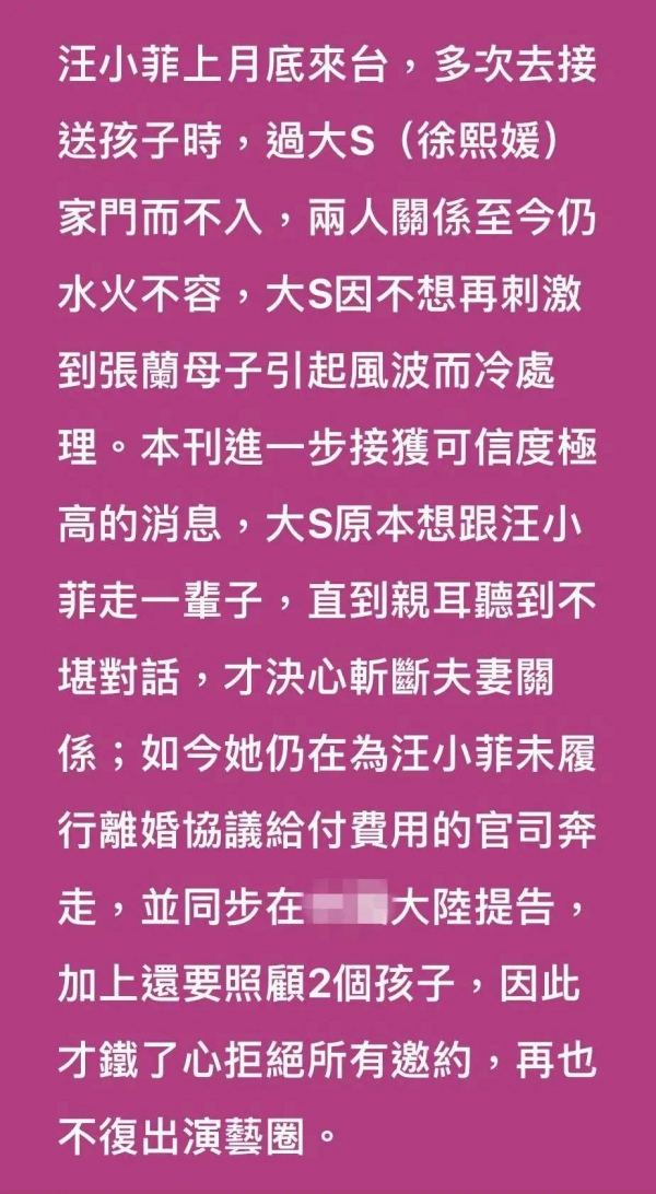 另外台媒还爆料称,大S在这段感情中付出了很多,期间还流产了两次。众所周知,两人曾在生下两个孩子后,大S还曾再次怀孕,但是最终因为身体原因不得不终止怀孕。之后紧接着大S就和汪小菲录制了综艺节目《幸福三重奏》,当时的大S身体尚未恢复,整个人的状态肉眼可见的虚弱。