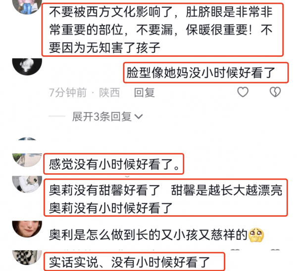 不过更多的评论在说奥莉不如小时候漂亮了,长得越来越像妈妈。