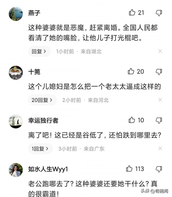 也有网友评论说,我向来不劝人离婚的,但是这个真的太过分了,真的没必要再过下去了,这儿媳还是很有教养的!换成我估计直接扭打起来了。