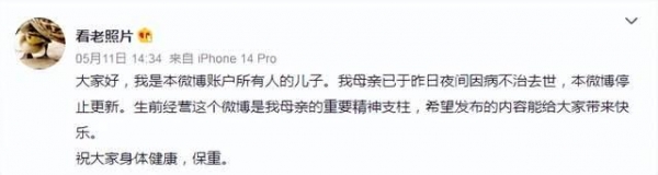 "大家好,我是本微博账户所有人的儿子。我母亲已于昨日夜间因病不治去世,本微博停止更新。生前经营这个微博是我母亲的重要精神支柱,希望发布的内容能给大家带来快乐。祝大家身体健康,保重。"