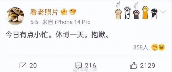如果因为事情忙没来得及更新,她还会向粉丝道歉:"今日有点小忙。休博一天。抱歉。"