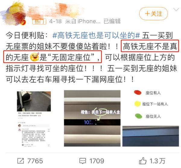 有网友表示"高铁无座不是真的无座,是'无固定座位',可以根据座位上方的指示灯寻找可坐的座位"。
