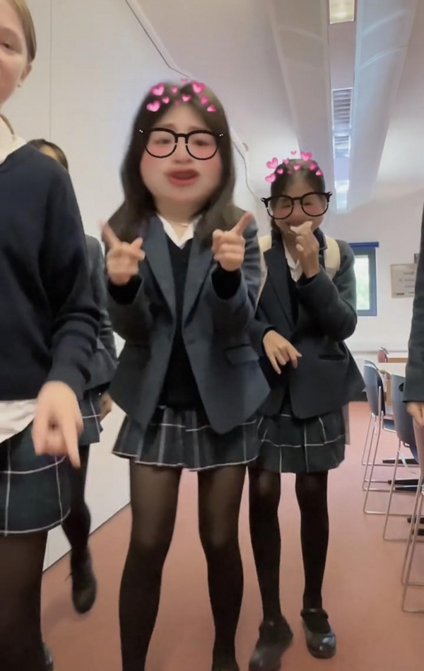 王诗龄使用了变脸特效,脸变得大了好几圈,模样十分可爱。王诗龄学校的校服很时尚,西服外套搭配格子短裙,尽显青春活力。她和朋友们都穿着黑丝袜,显得腿更细了。