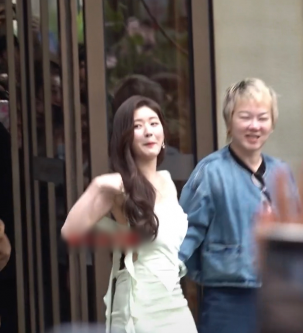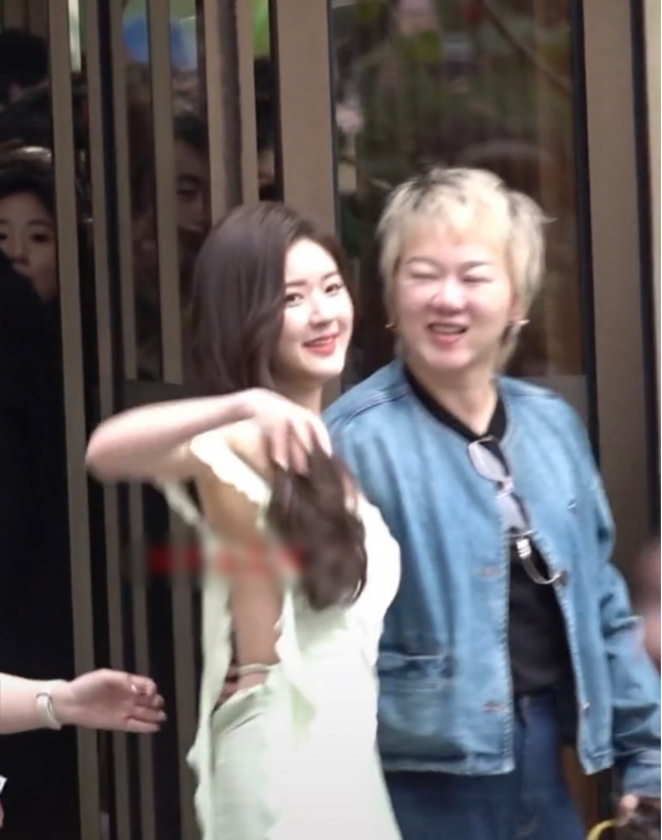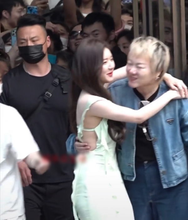 等两人拥抱结束后,松垮的肩带瞬间掉到手肘上方,赵露思身后的工作人员还来不及伸手拉住肩带,场面十分尴尬。