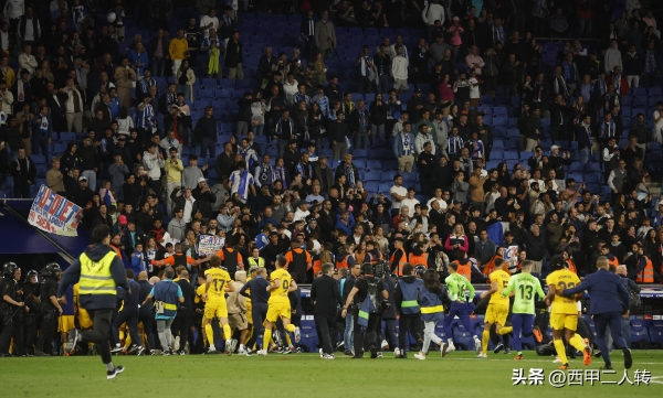 闯入球场的西班牙人球迷越来越多,所幸的是巴萨球员及时撤离,否则可能造成无法预测的后果。
