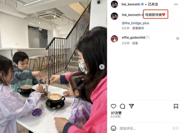 5月14日是母亲节,这在霍启刚家必须是一个大日子,为郭晶晶庆祝节日彰显他对妻子的尊重。当日,霍启刚分享了一家五口近照,并说"母亲节快乐"。