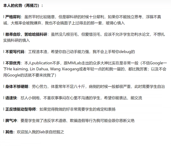 邵典在知乎个人账号发布招生指南中列出自己的优劣势。