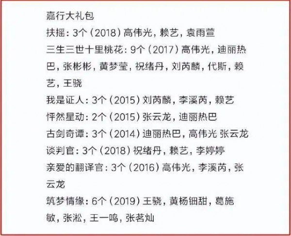 据粉丝统计,在嘉行期间,杨幂接触的外戏《盛夏晚晴天》要带3位旗下艺人,《古剑奇谭》也带3位,《我是证人》还是3位,《怦然心动》2位,《翻译官》3位,《扶摇》3位,至于热播剧《三生三世十里桃花》,同公司艺人达到了9位数,这节奏可以说是把剧组当自家后花园了。