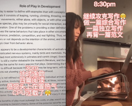为了减少拖延,她还在社交平台上发布vlog,让网友督促监工。每天起床后素颜出镜,丝毫没有容貌焦虑。早饭连做带吃,用时不到20分钟。写论文做作业也要上好闹钟,恨不得一天当48小时来过。