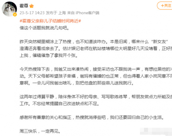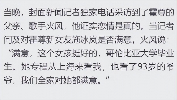 北京时间5月17日,此前在社交媒体上官宣了自己恋情的霍尊时隔几年再次登上了热搜,只是这一次他迎来了大家的祝福而不是唾骂。而霍尊的父亲知名歌手火风也来凑热闹,根据记者独家电话采访得到的消息,火风对这个未来儿媳十分满意,还表示两人婚期将近了。