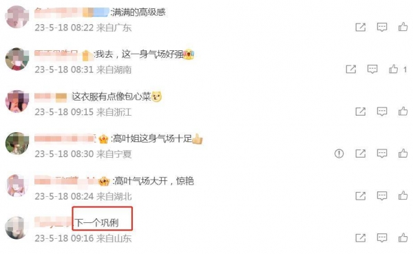 看到高叶在现场的表现,有网友直接表示:下一个巩俐!大家都知道,巩俐作为国际巨星,有非常多出名的作品,当然她也是戛纳红毯的常客。而网友们把她称为下一个巩俐,足以说明高叶在粉丝们心中的地位。