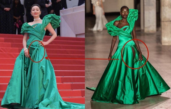 把这件来自Georges Chakra2023的春夏高定礼服,弄得松松垮垮、皱皱巴巴的,裙摆上都是褶皱,连基本的熨平都没有。