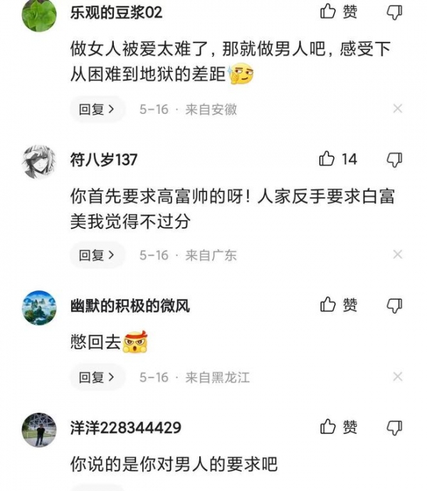 有网友评论说,人与人的相处,都是对等的,如果自己对对方相貌要求不苛刻,也不会认为自己是因为不漂亮才不被爱。