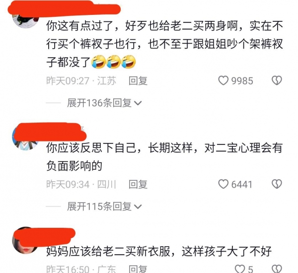 有网友评论说,你这有点过分了啊,好歹给老二买两身啊,再不济买个裤衩也行,也不至于跟姐姐吵个架裤衩子都没了。