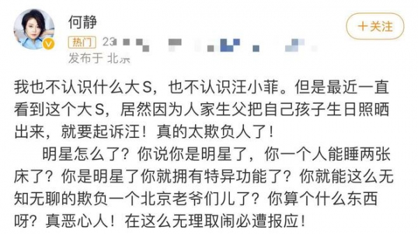 引人注目的是,歌手何静也在社交账号上发文,称自己不认识大S,也不认识汪小菲,但她一直关注着两人的事情,认为大S因为汪小菲晒亲生孩子的照片而起诉对方,"真的太欺负人了"。