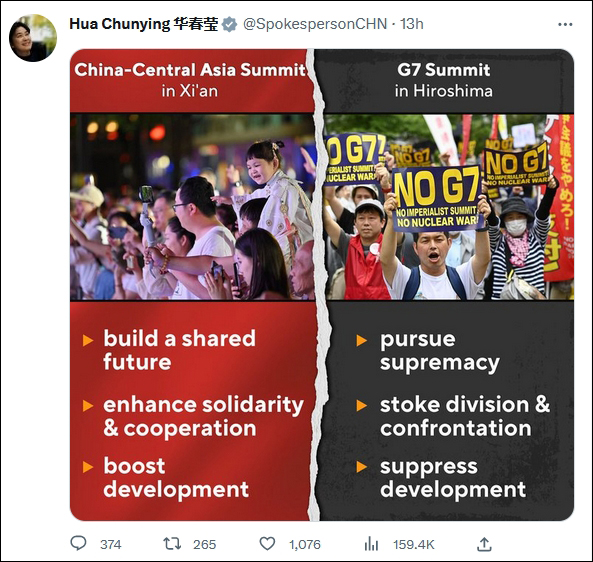 北京时间20日晚,中国外交部部长助理、发言人华春莹在社交媒体推特上发出两场峰会的对比图。左边中国-中亚峰会聚焦"共建未来,加强团结合作和促进发展",配图是会议前夕游人如织、共襄峰会盛举的西安大唐不夜城。右边G7广岛峰会则"寻求霸权,煽动分裂对抗和压制发展",配图是峰会首日高举手幅、抗议峰会召开的日本游行民众。