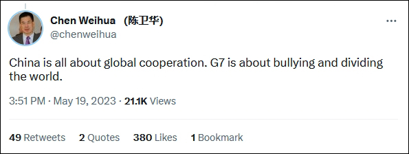 中国日报社欧盟分社社长陈卫华也在华春莹相关推文下留言道:"中国是为了全球合作,G7则是为了霸凌和分裂世界。"