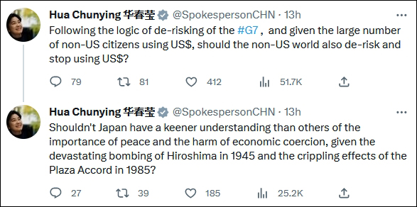 "按照G7去风险的逻辑,鉴于有大量非美国公民使用美元,非美元世界是否也应该去风险并停止使用美元?"华春莹进一步质问道,"鉴于1945年对广岛的毁灭性轰炸和1985年《广场协议》的破坏性影响,日本难道不应该比其他国家更深刻地认识到和平的重要性以及经济胁迫的危害吗?"