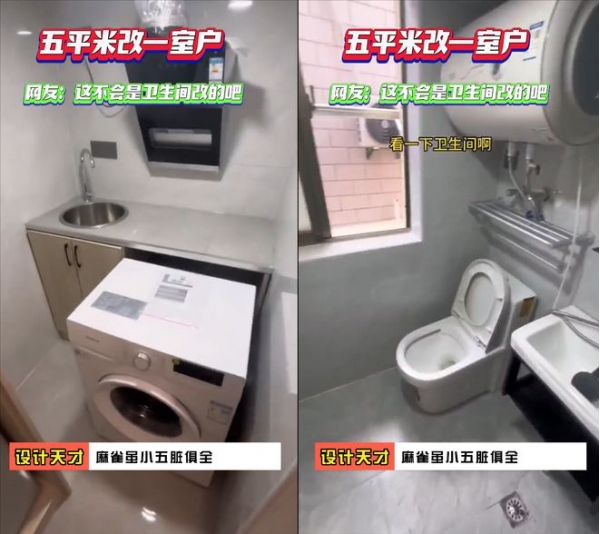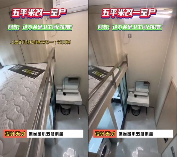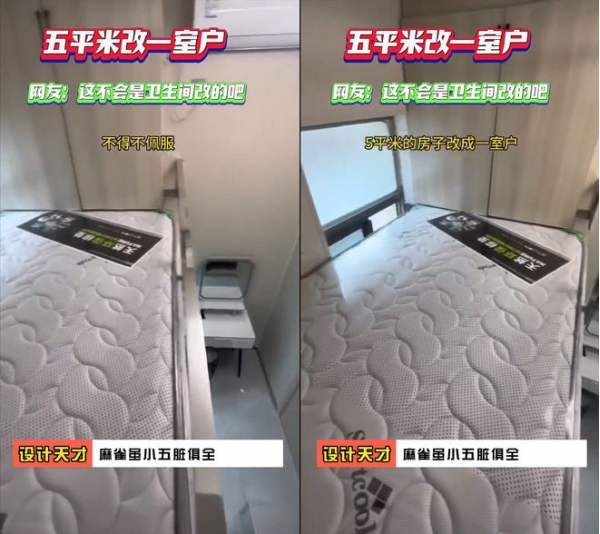 视频镜头前这套宛如厕所改成的居室就是画面中小伙花1600元租来的,虽然屋内空间仅有5平米大小,但房东硬是做出了复式一室户,可谓是麻雀虽小五脏俱全,令不少网友看后不由得直呼:设计师请收下我的膝盖。