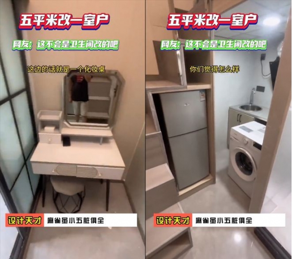 只见推开入户门左手边是厨房,右手边是可以充当饭桌的化妆台,接着往里走左边安装了洗手池,旁边还放置了一台洗衣机,而右边则用一堵隔墙加上玻璃推拉门围成了一个卫生间,里面有马桶、热水器、空调等等。