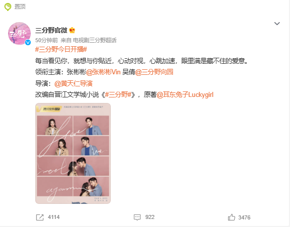 吴倩在新剧《三分野》中饰演的女主向园也是一位勇敢追爱的大小姐,新海报中笑容明媚,和张彬彬饰演的男主徐燕时四目相对,心动的情绪随着眼神流淌而出,这对CP的氛围感也太绝了!