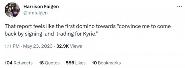 湖人队记Harrison Faigen迅速跟进解读,认为这是詹姆斯在向湖人管理层施压,他写道:"这个报道感觉就像是(詹姆斯在说)'通过先签后换搞来欧文我就回来'的第一张多米诺骨牌。"