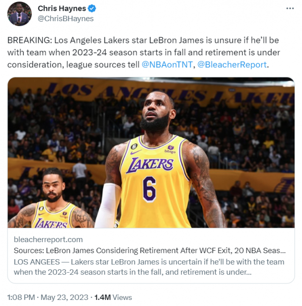 消息最先由名记Chris Haynes曝出,他指出詹姆斯不确定下赛季是否回归并且考虑退役。