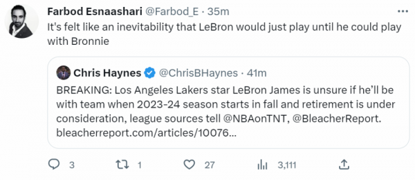 另外一名快船队记Farbod Esnaashari也表示这一消息并不可信,因为詹姆斯一定会打到与布朗尼同台竞技,这是一定会发生的事情。