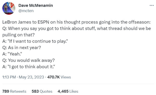 ESPN名记Dave McMenamin迅速跟进报道,公布了相关采访的完整内容,指出詹姆斯的确亲承考虑退役。