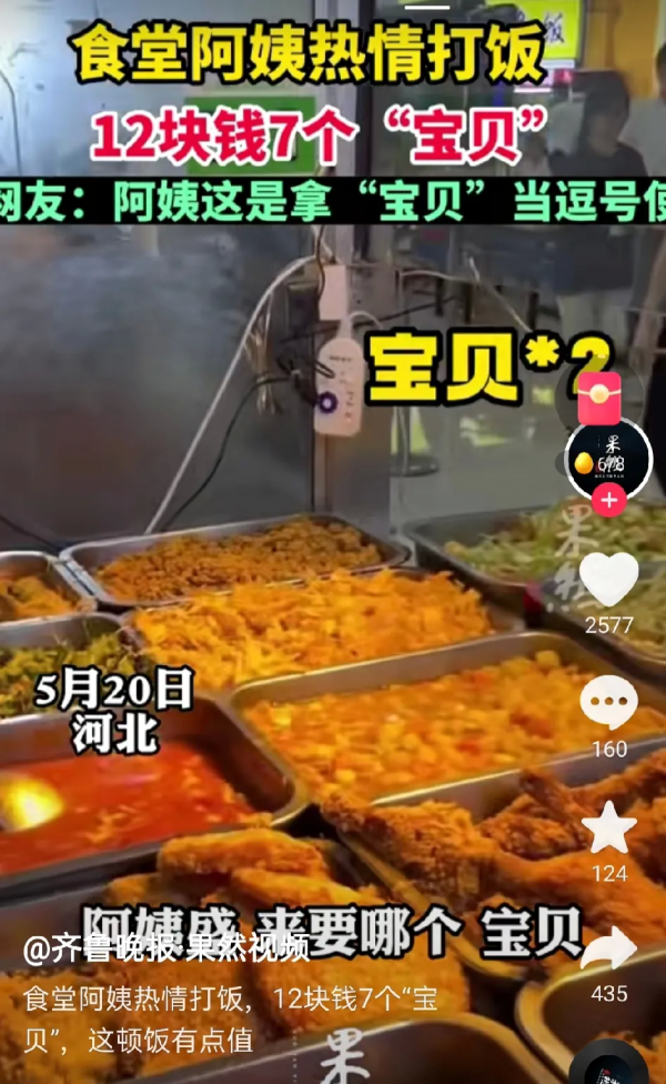 太暖心了!5月20日,河北,一食堂阿姨打饭,不但手不抖,还一口一个宝贝,男生花12块钱,打4个菜,被喊了7个宝贝。网友:孩子迷失在这一声声的宝贝中了。