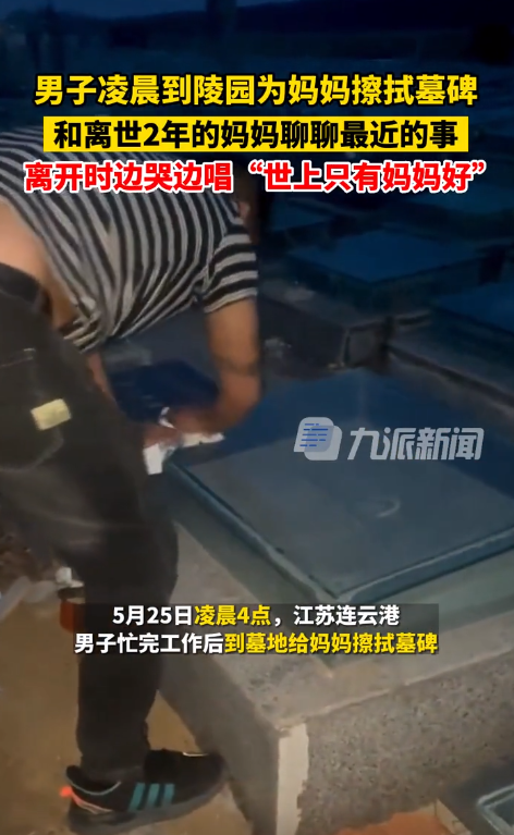 5月25日,根据九派新闻视频报道,江苏连云港一男子凌晨到陵园为妈妈擦拭墓碑 ,和离世2年的妈妈聊最近的事,离开时边哭边唱"世上只有妈妈好",此事引发网友关注。