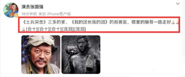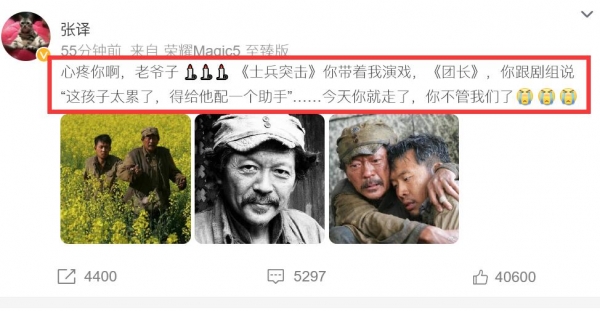张译和罗京民在《士兵突击》中有不少对手戏,两人的感情很是深厚。得知罗京民去世,他晒出两人合作感慨:心疼你,老爷子,今天你就走了,你不管我们了。