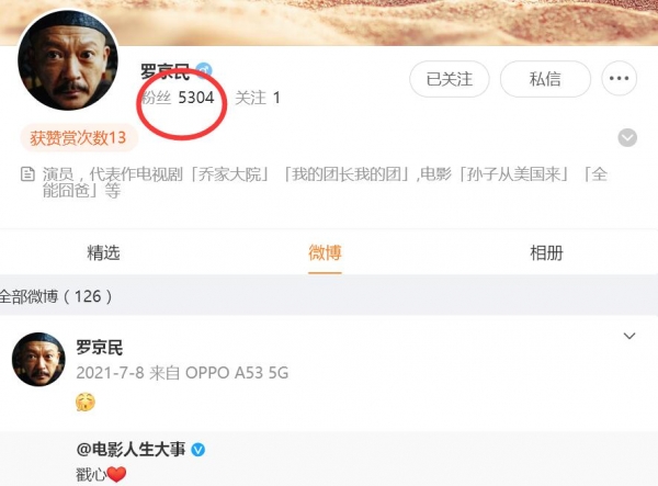 罗京民的微博粉丝只有5000多,他的微博却寥寥无几,其中一条还是宣传电影《人生大事》,和其他老戏骨比起来,可谓低调至极。