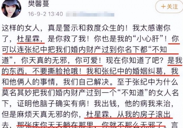 2016年9月,樊馨蔓突然在网上发文让杜星霖滚出她的房子,控诉对方插足她与张纪中的婚姻,并且爆料张纪中已经把他们的婚内财产转移到了杜星霖的名下。