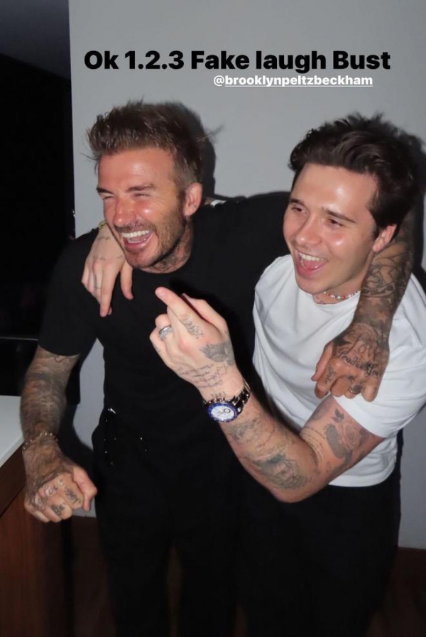 贝克汉姆与长子布鲁克林合影,两人像极了好朋友。父子俩尽管是在假笑,但仍能看得出小贝心情非常不错。