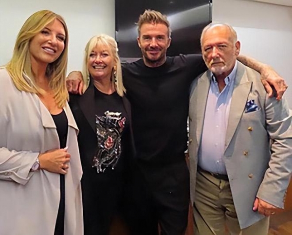 特德·贝克汉姆夫妇与贝克汉姆、乔安妮·贝克汉姆四人合影,看来,小贝生母桑德拉·贝克汉姆没有同行。
