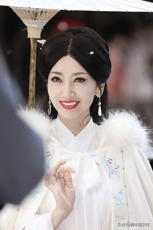 照片中,赵雅芝身穿传统的水袖襦裙,头戴蝴蝶发饰,身披山水染色斗篷,气质古典优雅,古风十足,让人不禁想起她在《新白娘子传奇》中的经典扮相。