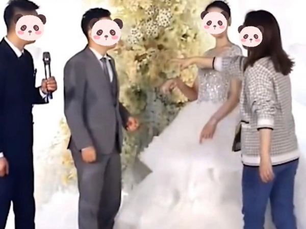 很快就有男方亲友上台来把前女友劝走,新娘虽然生气,也不能拂袖而去,只能将婚礼继续。