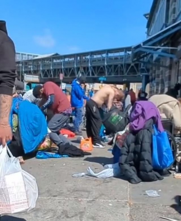 画面显示,在费城肯辛顿社区,成群的瘾君子如同电影中的僵尸一般,漫无目的地弯腰前行,街头遍布帐篷,垃圾散落一地。许多瘾君子光天化日之下注射毒品,还有不少吸毒者昏倒在地上。