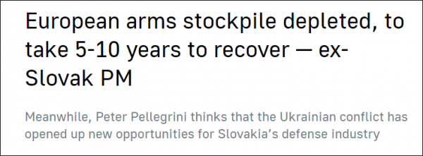 另据塔斯社12日报道,斯洛伐克前总理彼得·佩莱格里尼表示,整个欧洲的武器仓库已经被搬空,所有军队都需要补充物资,这将是5到10年的工作量。佩莱格里尼还表示,由于缺乏资源,斯洛伐克将无法再向他国提供大量军事援助。
